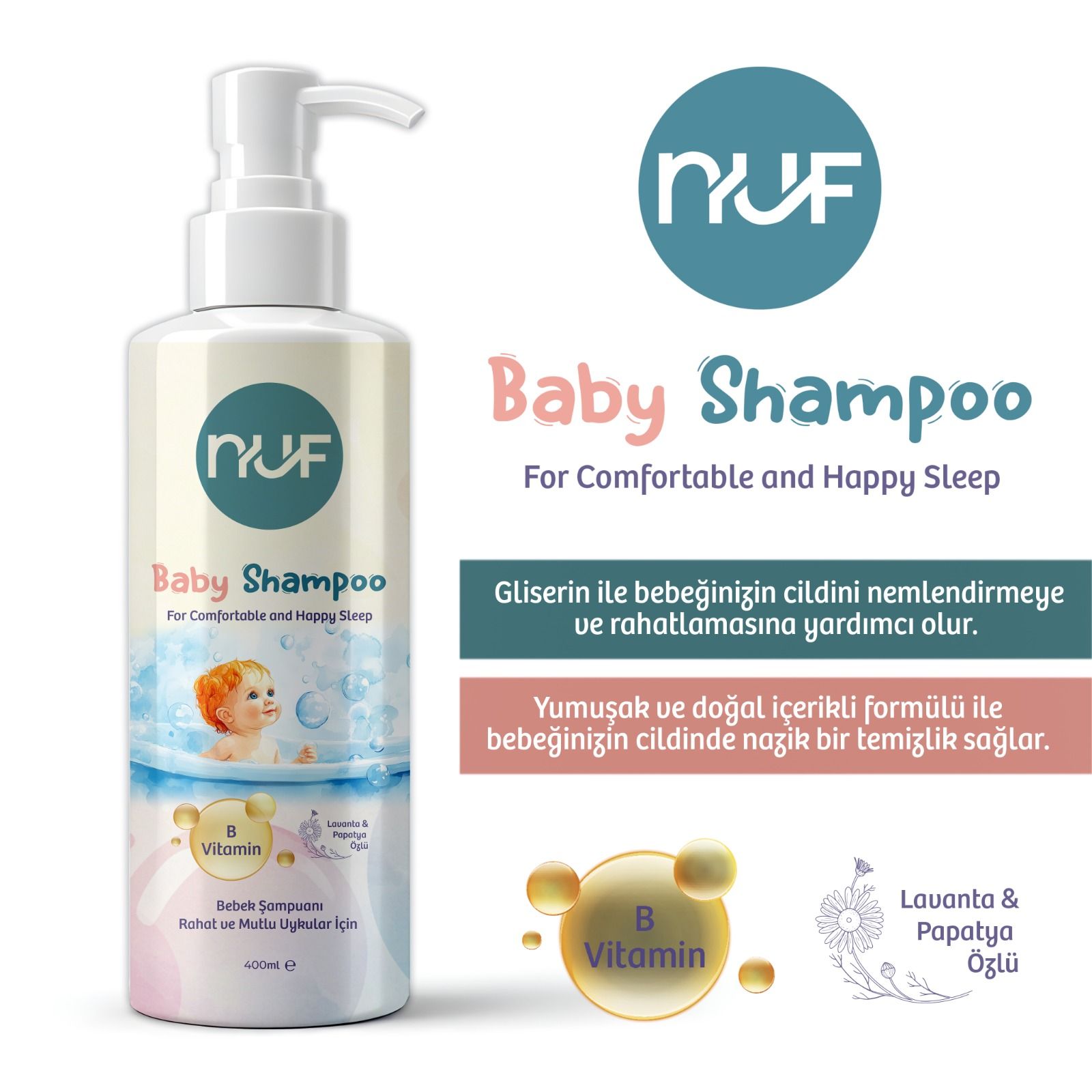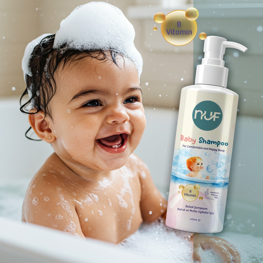 Nuf Kozmetik Bebek Banyo Şampuanı, yeni doğan bebeklerden itibaren tüm çocuklar için güvenle kullanılabilecek şekilde formüle edilmiştir.